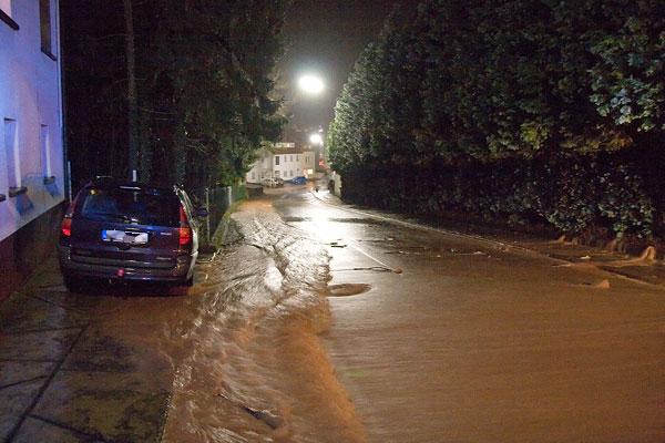 Auch in Dirmingen sorgte ein verstopfter Kanaleinlauf in der Straße "Herrengärten" um 22:56 Uhr für einen Einsatz der Feuerwehr. Über die gesamte Straßenbreite suchten sich die Wassermassen beim Eintreffen der Einsatzkräfte ihren Weg bis zur Hauptstraße. Trotz der starken Strömung gelang es, Äste und Geröll zu entfernen und wieder einen freien Abfluss des Regenwassers zu schaffen.