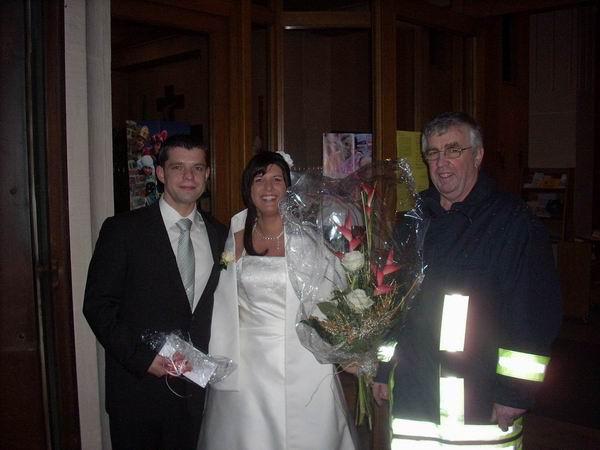 Dies nahmen die Kameradinnen und Kameraden unter der Führung von Löschbezirksführer Otmar Groß zum Anlass, dem Brautpaar vor der Kirche zu gratulieren. Ebenso musste Dominik Schallmo sein Können beim Löschen zweier Fackeln unter widrigen Bedingungen unter Beweis stellen. Aufgrund des einsetzenden starken Regens konnte sich seine Frau Katja im Eingang der Kirche unterstellen und beobachtete die Taten des Ehemannes. Im Anschluss überreichte Otmar Groß einen Blumenstrauß und ein Geschenk des LBZ Bubach - Calmesweiler.