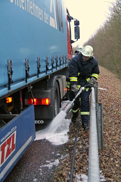Eppelborn. Aufmerksame Autofahrer bemerkten am 16. Januar 2008 die starke Rauchentwicklung an einem Lastzug, der die Autobahn A1 in Richtung Trier befuhr. Sie alarmierten sofort über Handy Polizei und Feuerwehr. Nachdem auch der Fahrer auf den Rauch aufmerksam wurde, hielt er sein Fahrzeug auf dem Standstreifen zwischen den Anschlussstellen Eppelborn und Tholey an.